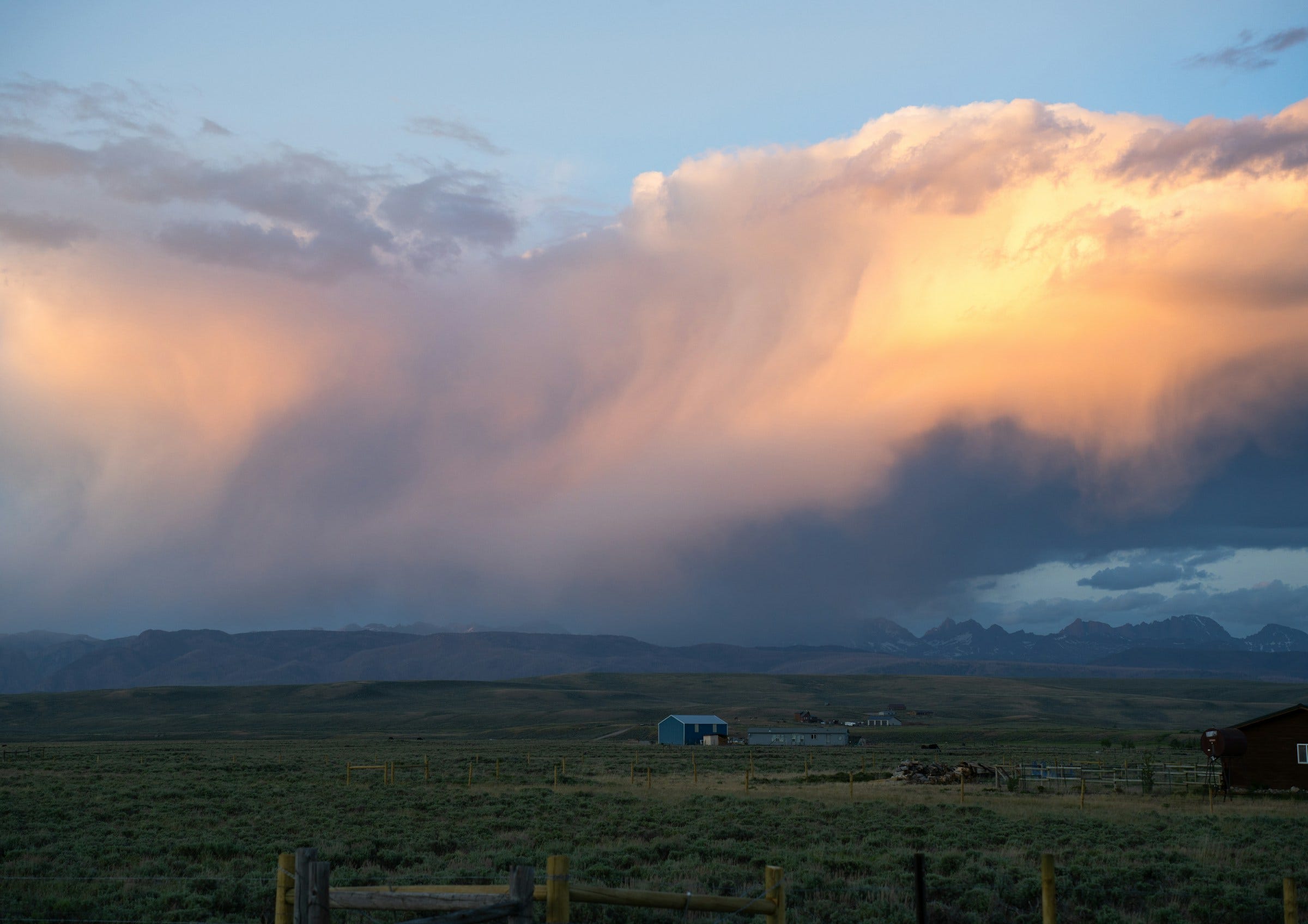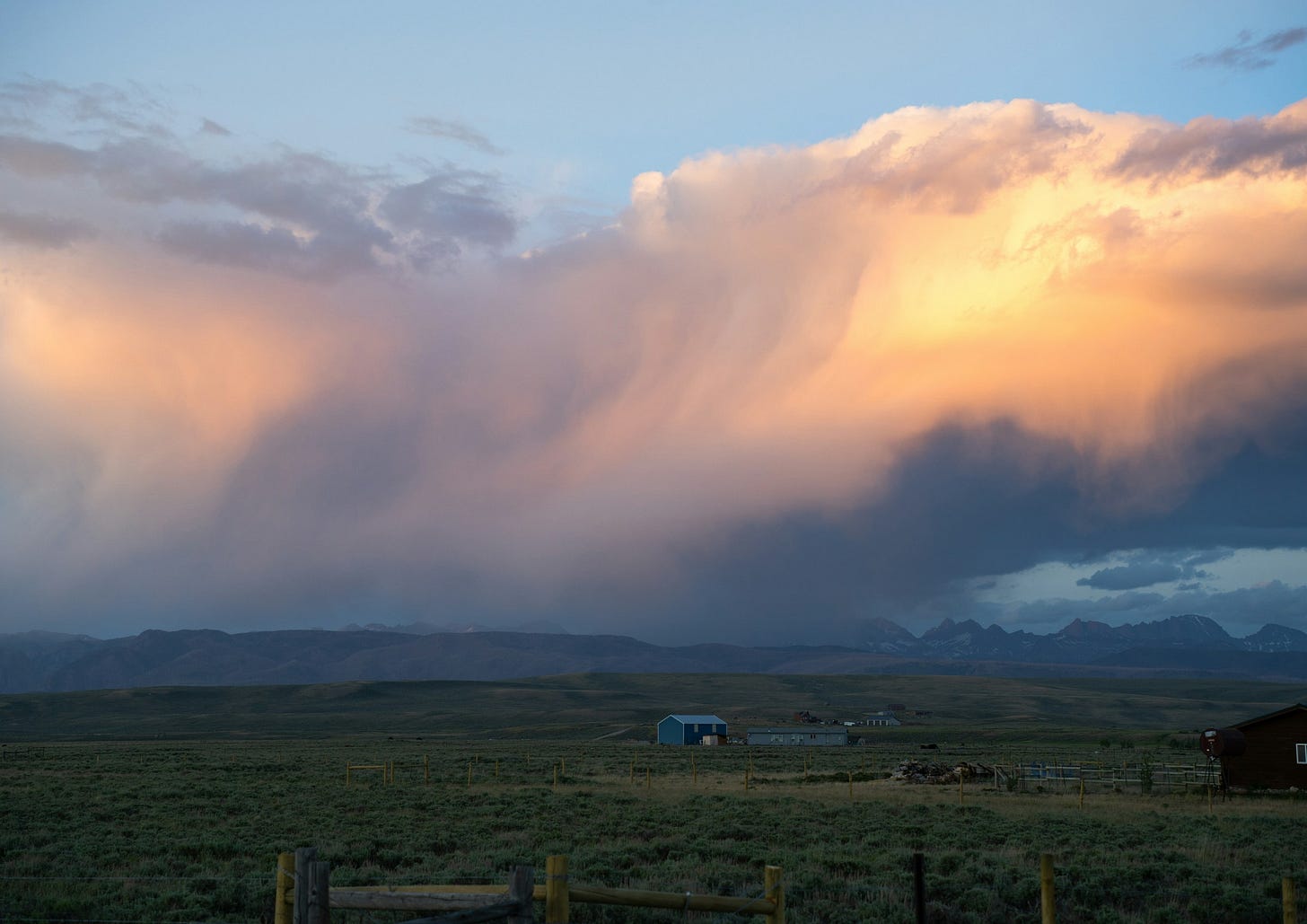 Blue sky, golden grass, tall sagebrush, mountains capped white behind. Chores done. Coffee in the sun room.